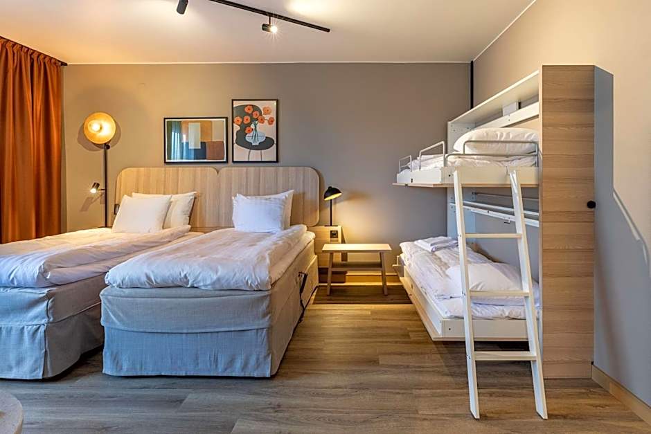 Standard Family Four is 312 square feet and includes 2 single beds 80-130 width plus a sofa bed and rollaways on demand.